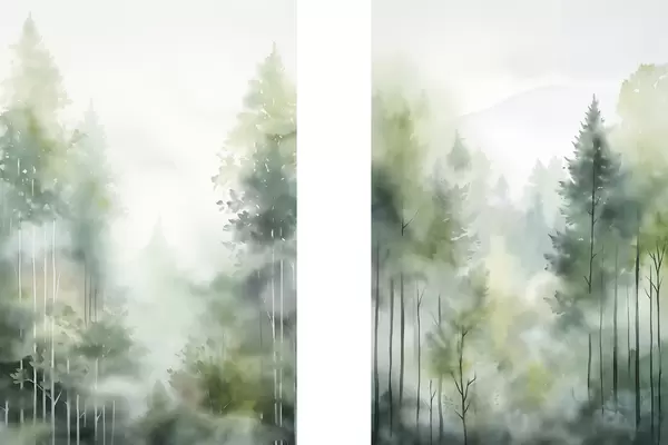 Poster Imitazione di un dipinto ad acquerello raffigurante una foresta astratta con alberi ad alto fusto e fogliame verde, colori tenui e delicati. Nr d01005