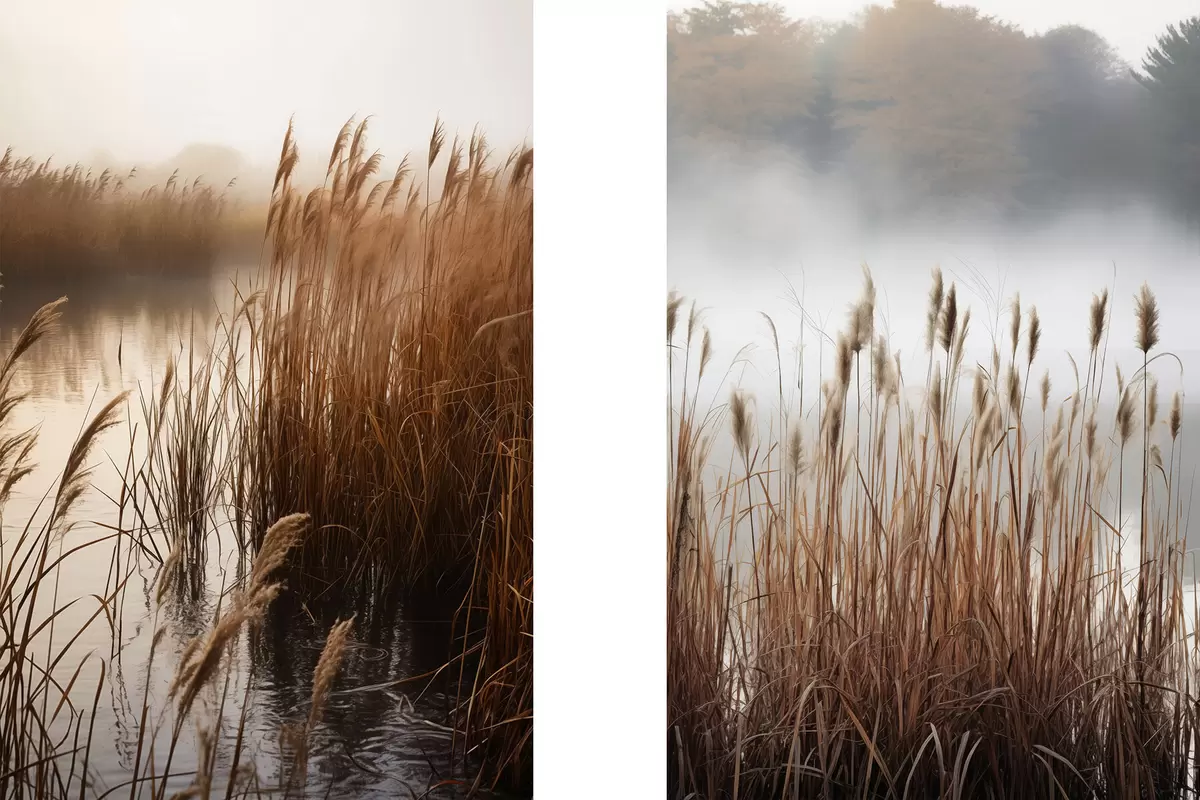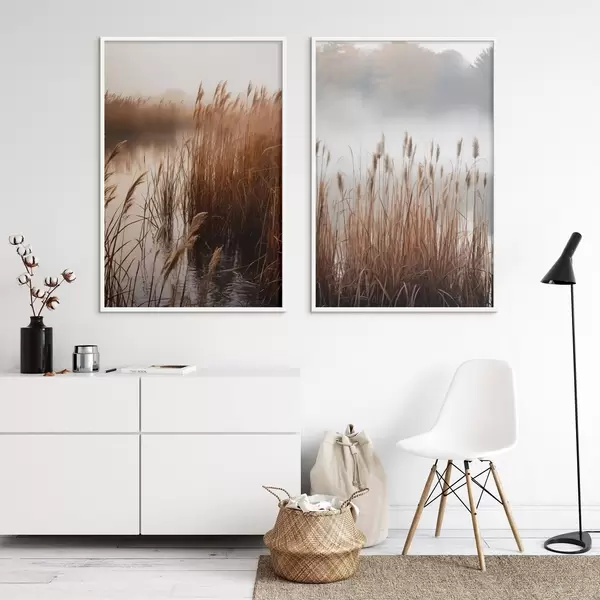 Poster Alte canne che crescono in uno specchio d'acqua, l'acqua riflette le canne, sfondo nebbioso, luce soffusa, scena naturale Nr d01008
