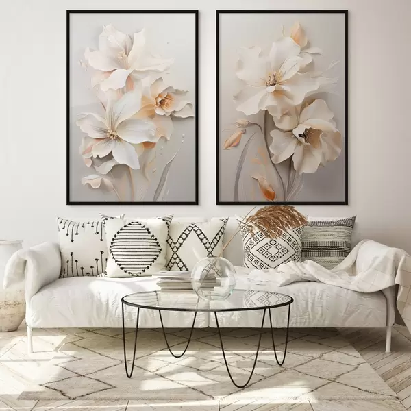 Poster Fiori bianchi, petali con ombre delicate, sfondo beige chiaro, composizione elegante, stile minimalista d01010