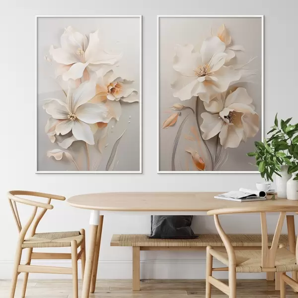 Poster Fiori bianchi, petali con ombre delicate, sfondo beige chiaro, composizione elegante, stile minimalista Nr d01010