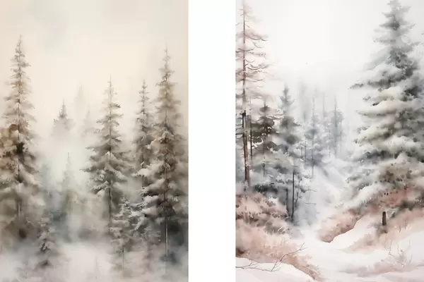 Poster Alti pini ricoperti di neve, immersi in una foresta avvolta dalla nebbia, una scena invernale morbida e ovattata. Nr d01011