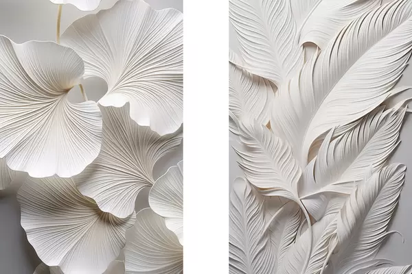 Poster Foglie bianche di ginkgo e foglie lunghe con dettagli intricati, che creano un effetto strutturato e stratificato, arte minimalista. Nr d01013