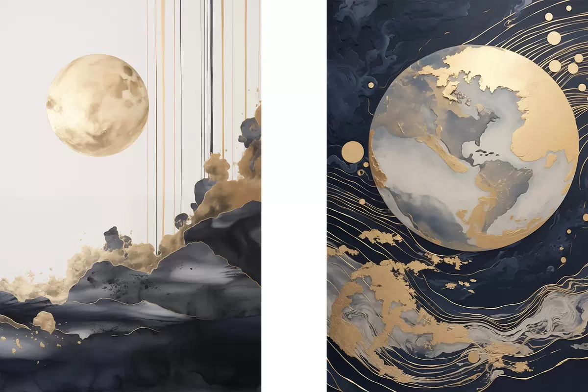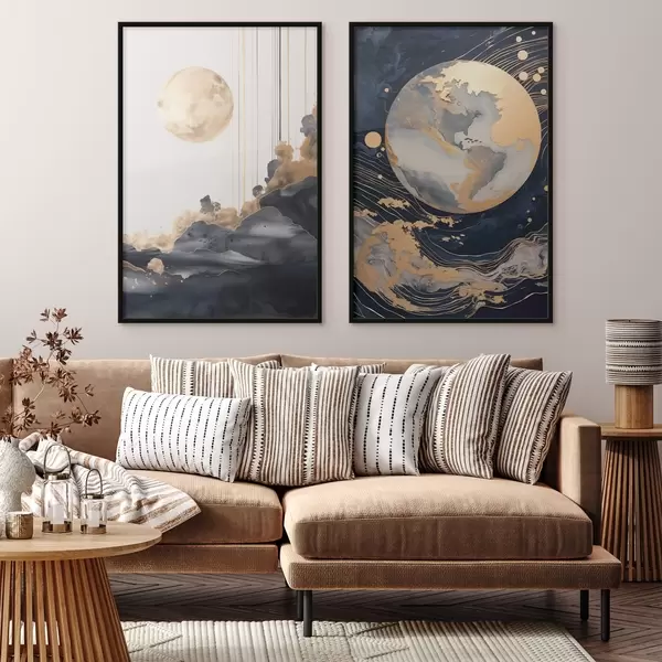 Poster Pianeta decorativo strutturato nello spazio con linee e punti gialli, stile astratto, minimalista e moderno Nr d01014