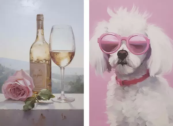 Poster Una bottiglia e un bicchiere di vino e un barboncino con gli occhiali, dipinto imitazione Nr d01021