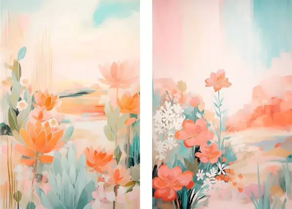Poster Motivi floreali in tonalità pastello sullo sfondo di una valle leggermente nebbiosa Nr d01085