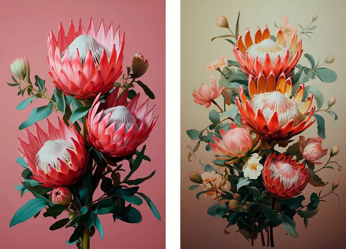 Poster Proteas in due atmosfere: sfondo rosa intenso e una calda sfumatura oliva Nr d01092