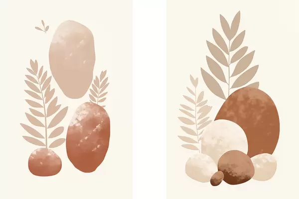 Poster Forme astratte, pietre e foglie con texture in tonalità tenui di pesca e terracotta, minimaliste, su sfondo color crema. d01114