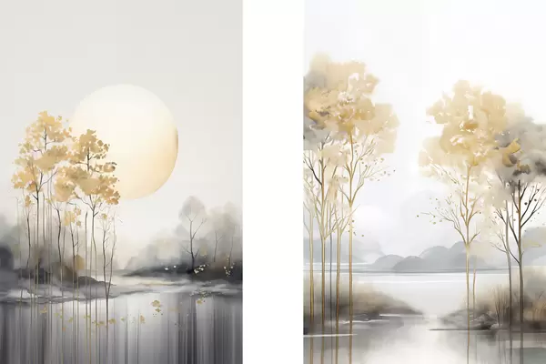 Poster Paesaggio astratto decorativo, alberi alti con foglie gialle, un fiume e nebbia sullo sfondo Nr d01115