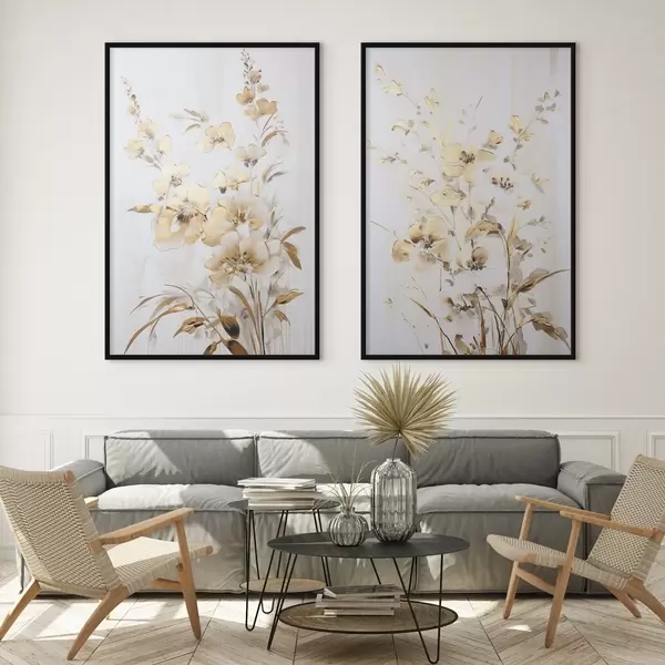 Poster Fiori e foglie gialli testurizzati su sfondo bianco, con delicate pennellate Nr d01116