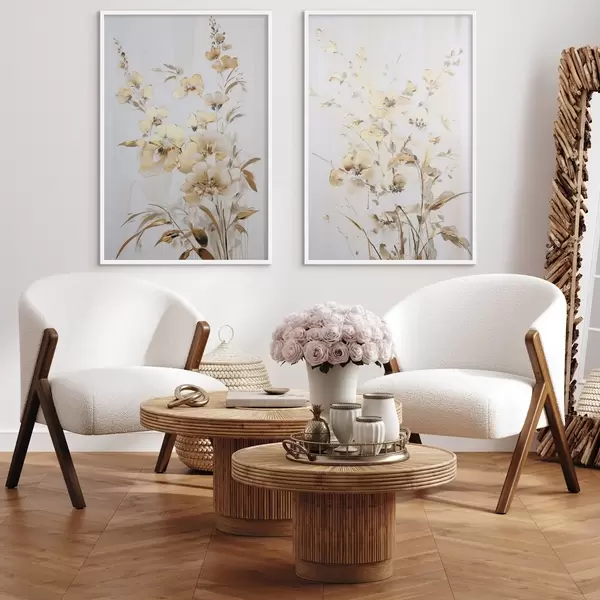Poster Fiori e foglie gialli testurizzati su sfondo bianco, con delicate pennellate d01116