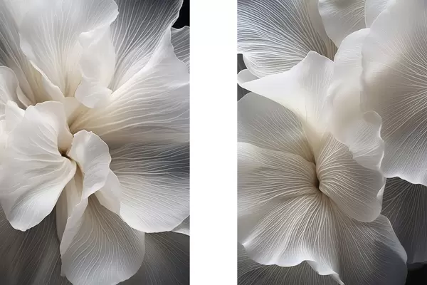 Poster Primo piano di delicati petali floreali bianchi astratti con linee intricate e uno sfondo scuro sfocato d01117