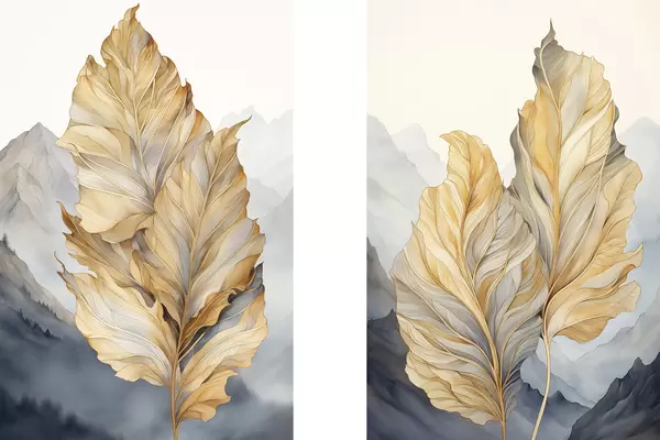 Poster Foglie astratte grandi, gialle e marroni con dettagli intricati, sullo sfondo di un paesaggio montano Nr d01119
