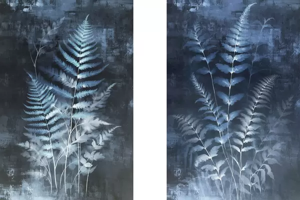 Poster Felci blu e piante su uno sfondo scuro e strutturato, con particolare attenzione ai dettagli intricati, effetto radiografico Nr d01121