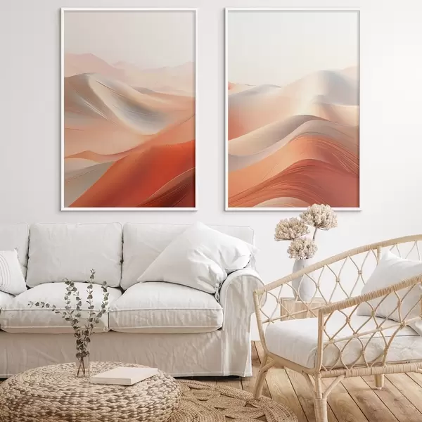 Poster Paesaggio desertico astratto con dune di sabbia fluenti nei toni caldi dell'arancio e del bianco d01123