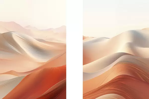 Poster Paesaggio desertico astratto con dune di sabbia fluenti nei toni caldi dell'arancio e del bianco d01123