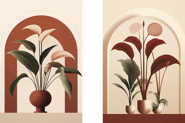 Poster Piante in vaso astratte con grandi foglie verdi e rosse davanti a un arco color crema d01124
