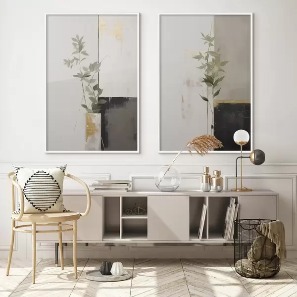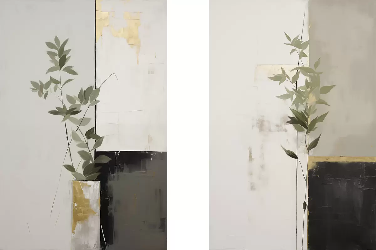 Poster Un dipinto minimalista e materico raffigurante un vaso con foglie verdi su uno sfondo di forme geometriche astratte. d01126