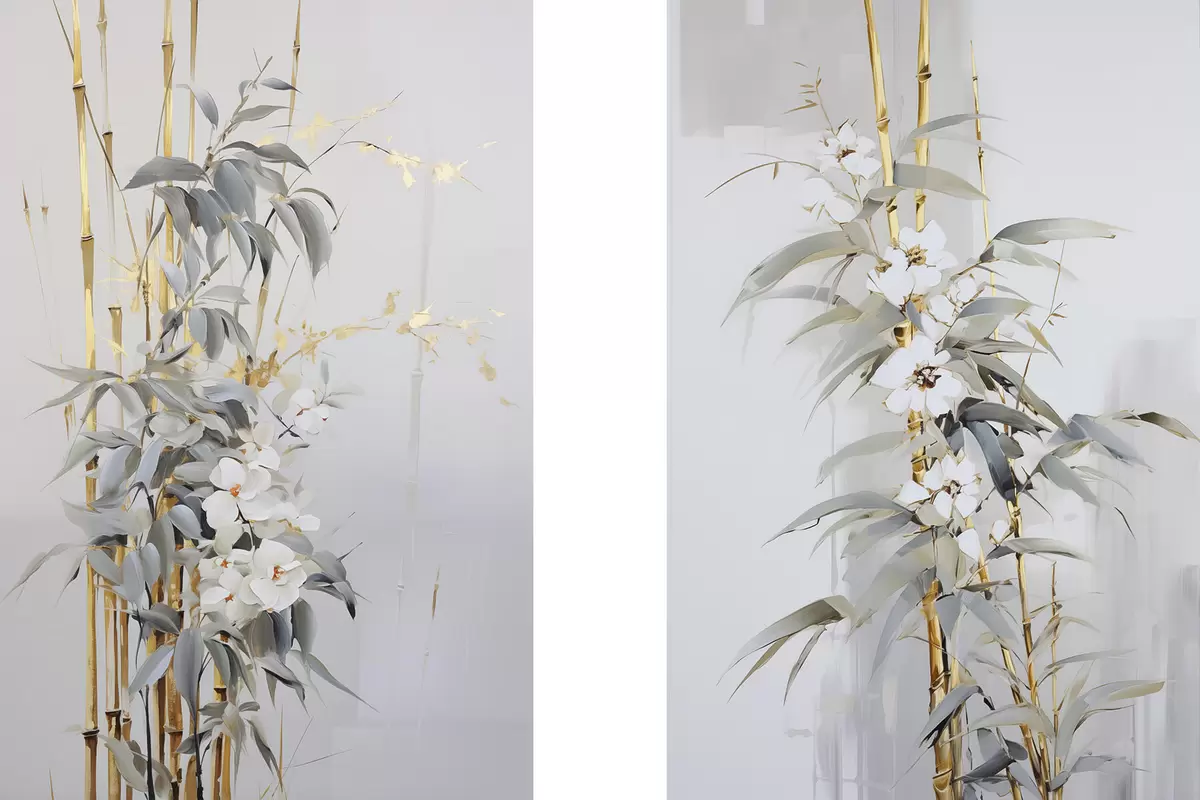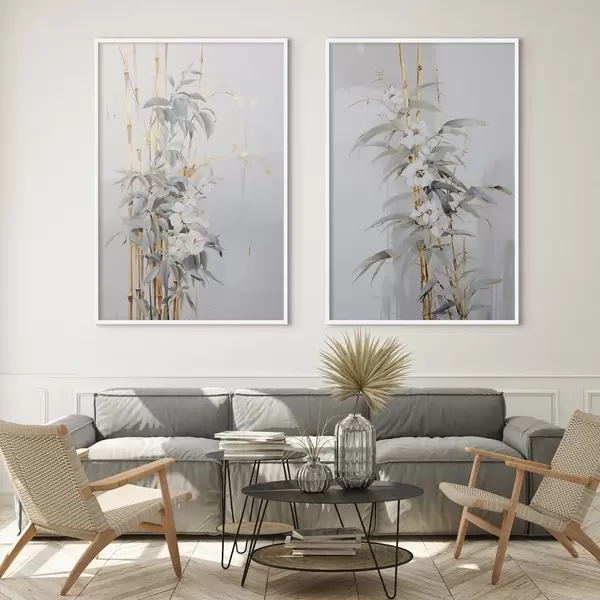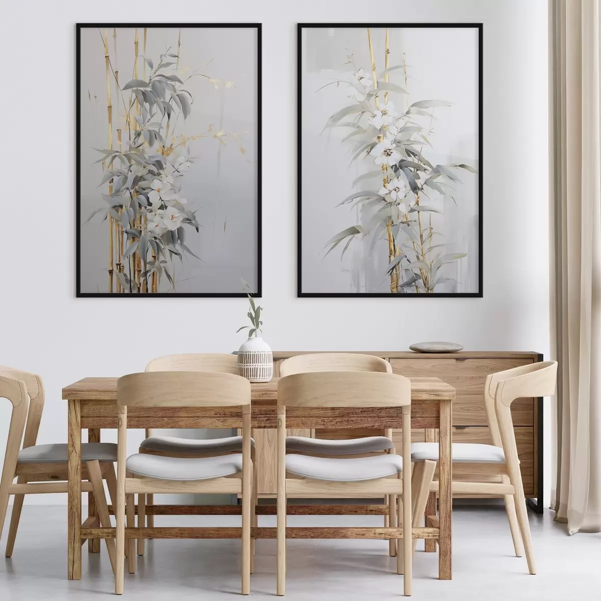 Poster Fusti di bambù astratti con accenti gialli, delicati fiori bianchi e foglie verde chiaro, sfondo grigio Nr d01127