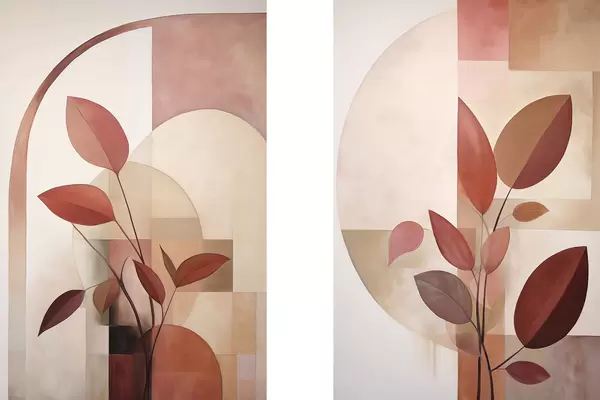 Poster Pianta astratta con foglie rosse su uno sfondo di forme geometriche e colori tenui e delicati Nr d01128