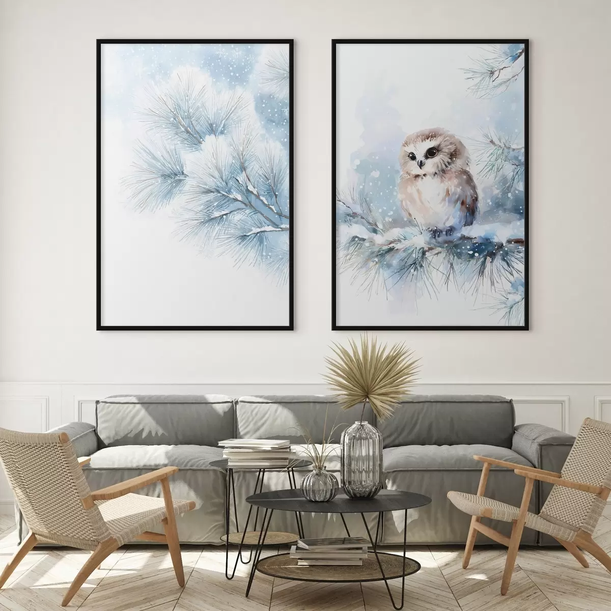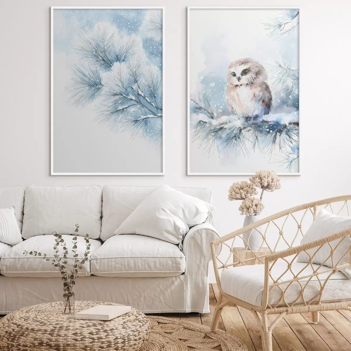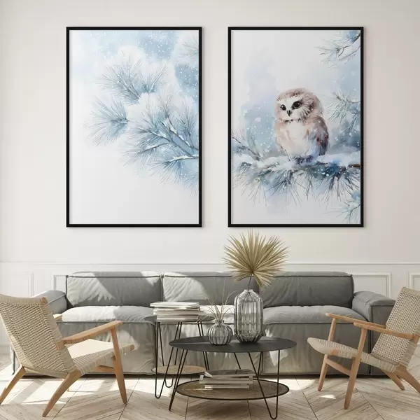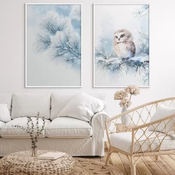 Poster simpatico gufo su un ramo di pino innevato in stile acquerello Nr d01168