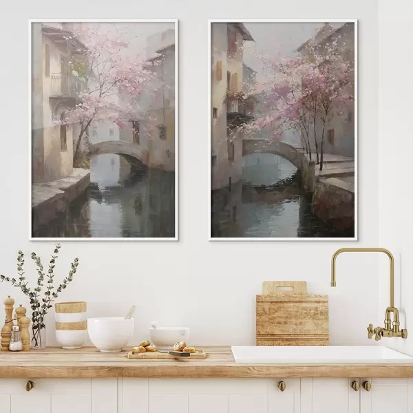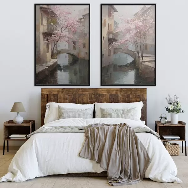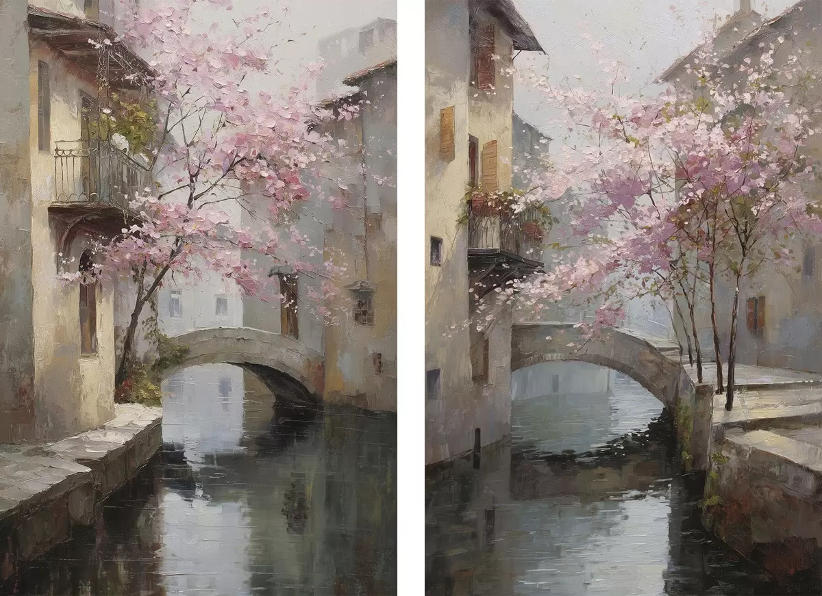 Poster romantico paesaggio urbano con un albero in fiore nello stile della pittura a olio d01173