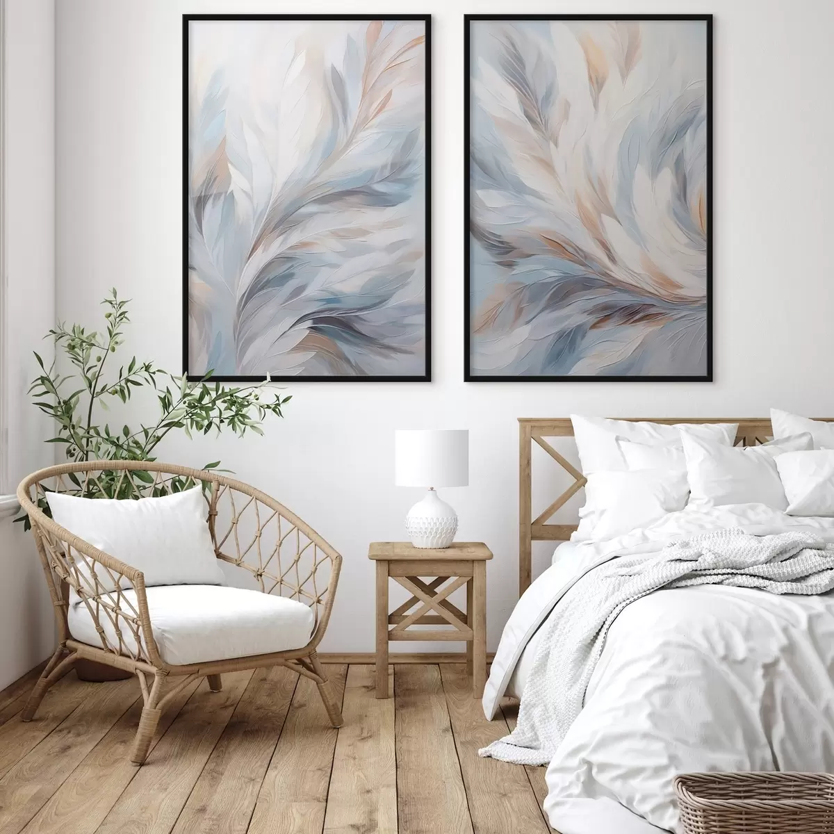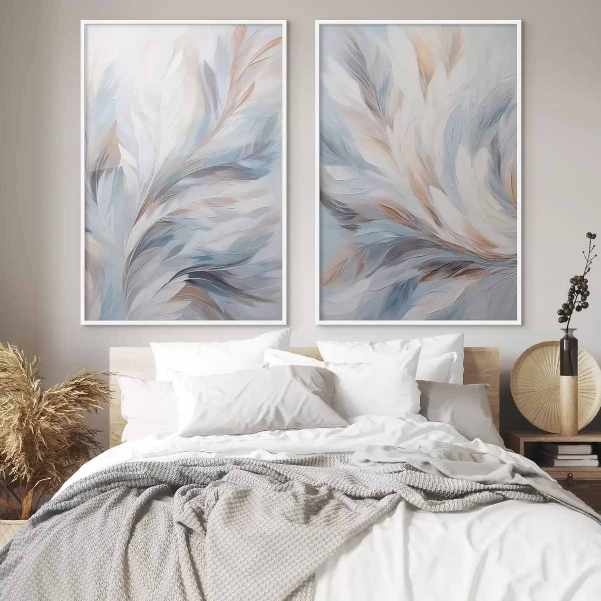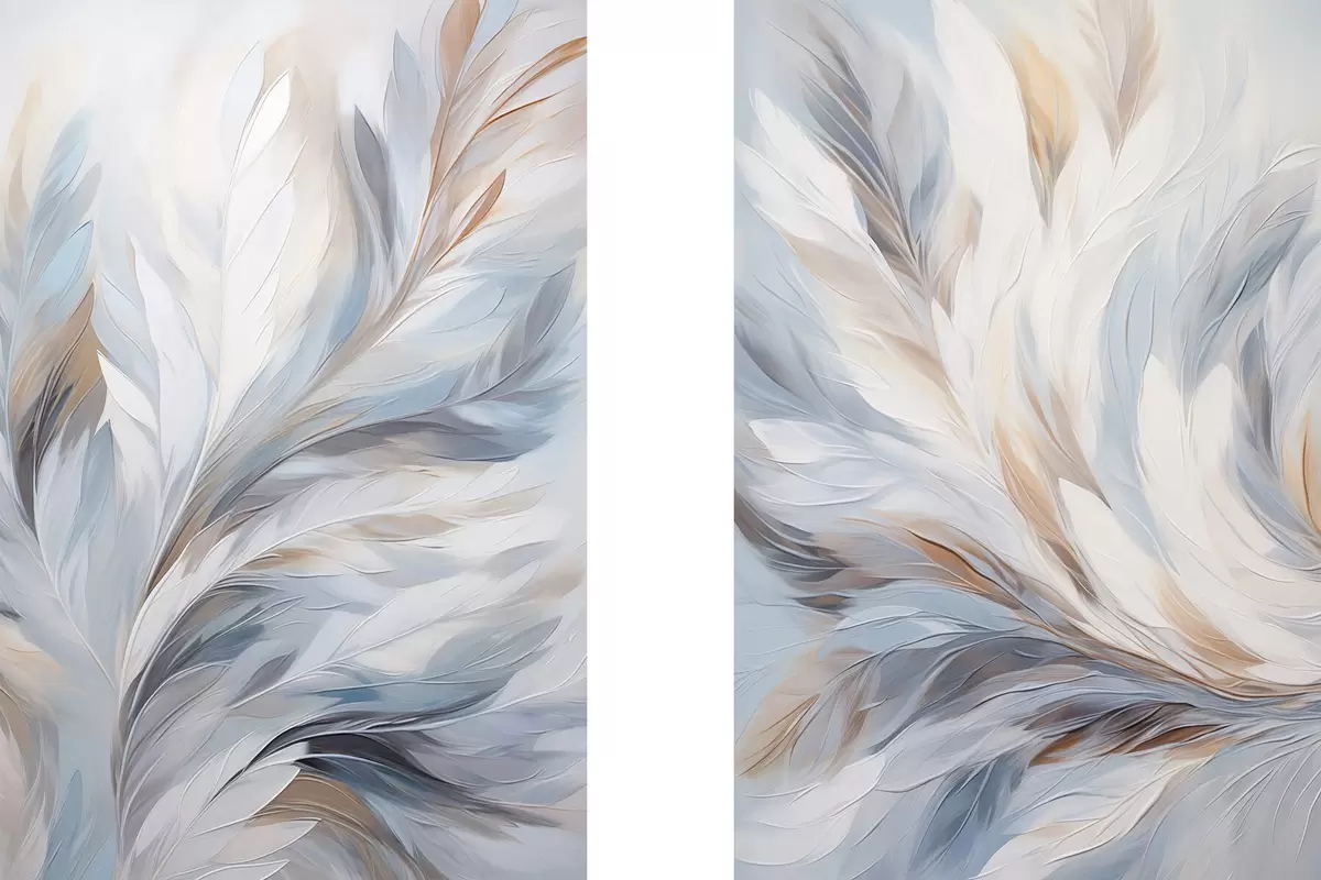 Poster Dipinto astratto di piume nei toni del bianco, blu e marrone, con una texture morbida e fluida e uno sfondo chiaro. d01234