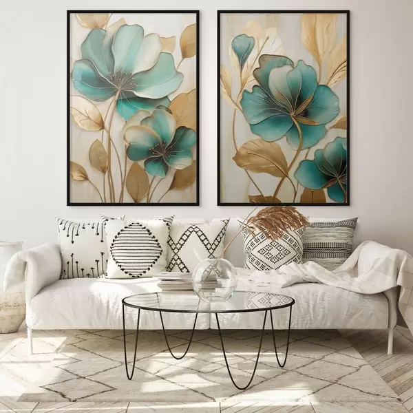 Poster Grandi fiori verde acqua e gialli con contorni, circondati da foglie gialle su sfondo astratto Nr d01235