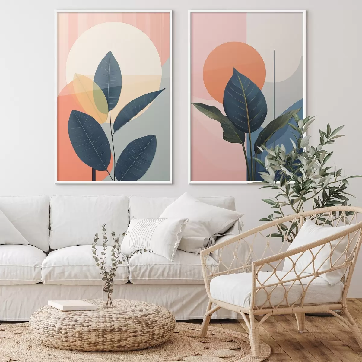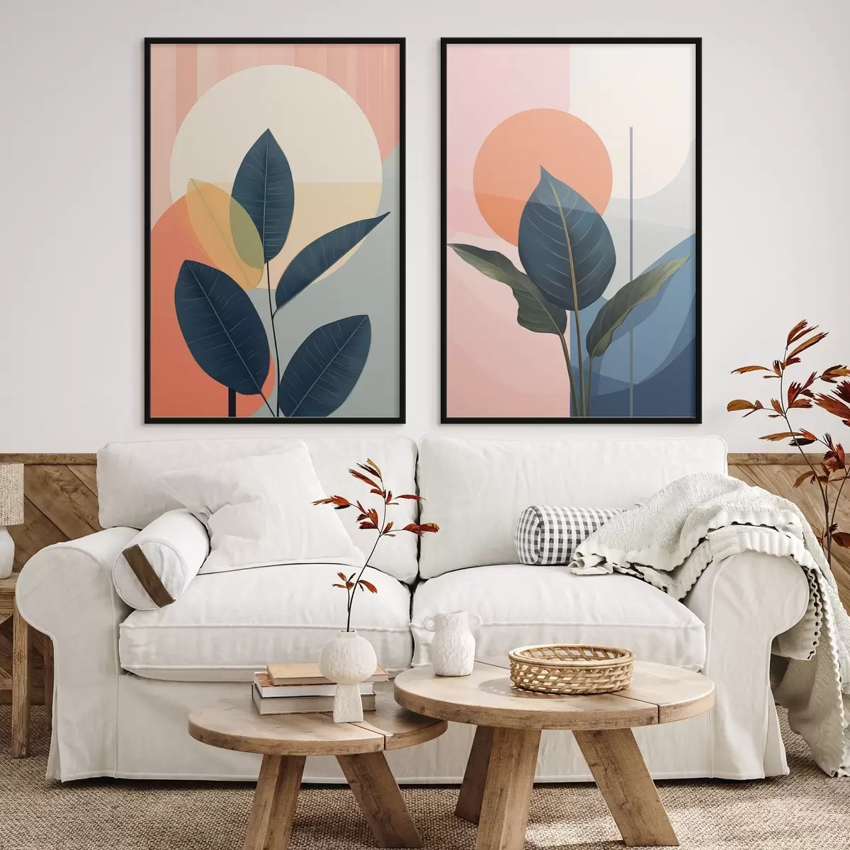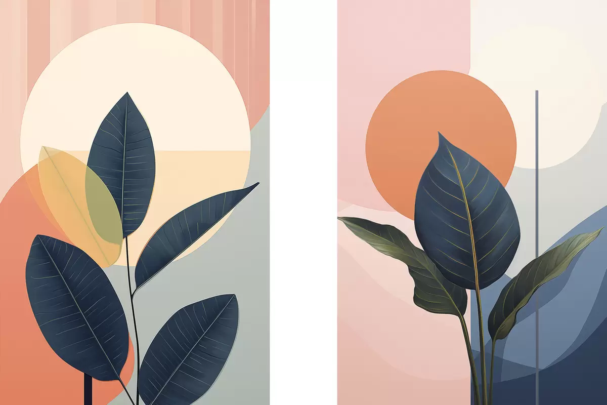 Poster Foglie scure su uno sfondo di forme astratte color pesca e grigio con un grande cerchio giallo pallido Nr d01238