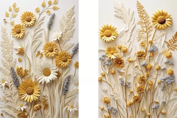 Poster Una collezione materica di margherite gialle e bianche con erbe secche e rametti di lavanda su sfondo bianco d01241