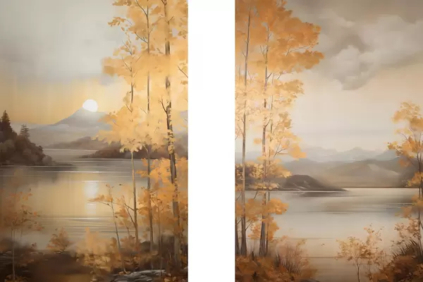 Poster Alberi autunnali dalle foglie arancioni incorniciano un lago tranquillo con montagne lontane sotto un cielo nuvoloso. Nr d01246