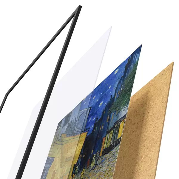 Il poster è composto da cornice, plexiglass, immagine stampata e supporto in truciolato. Il poster può essere immediatamente appeso alla parete grazie ai supporti sul retro.