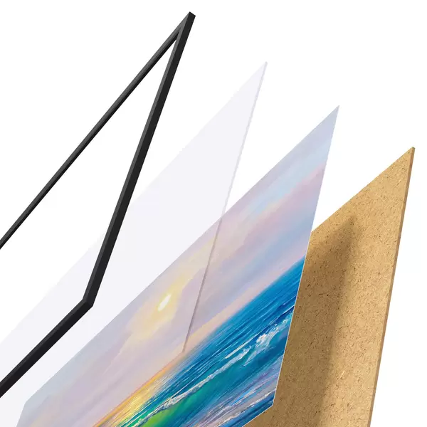 Il poster è composto da cornice, plexiglass, immagine stampata e supporto in truciolato. Il poster può essere immediatamente appeso alla parete grazie ai supporti sul retro.
