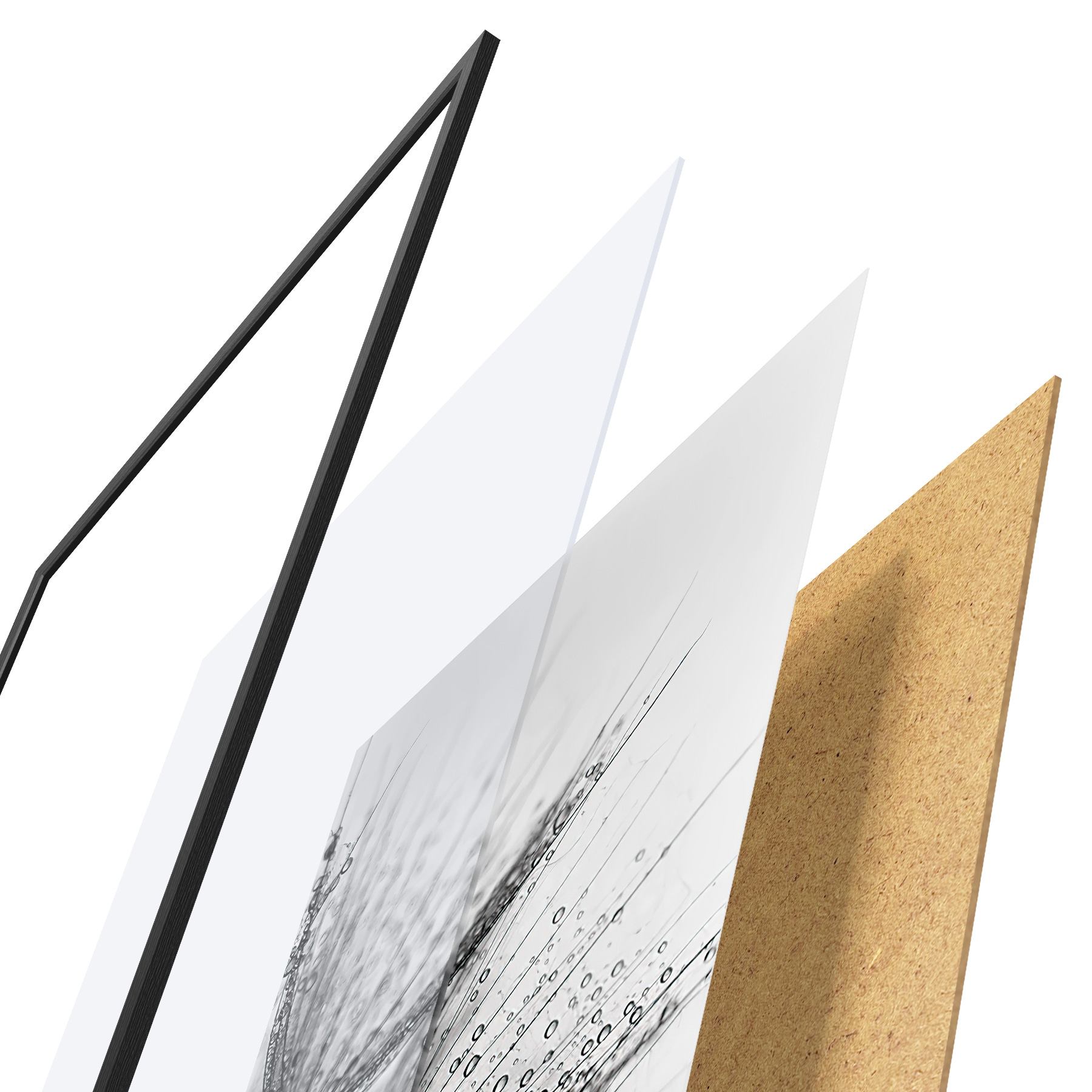 Il poster è composto da cornice, plexiglass, immagine stampata e supporto in truciolato. Il poster può essere immediatamente appeso alla parete grazie ai supporti sul retro.