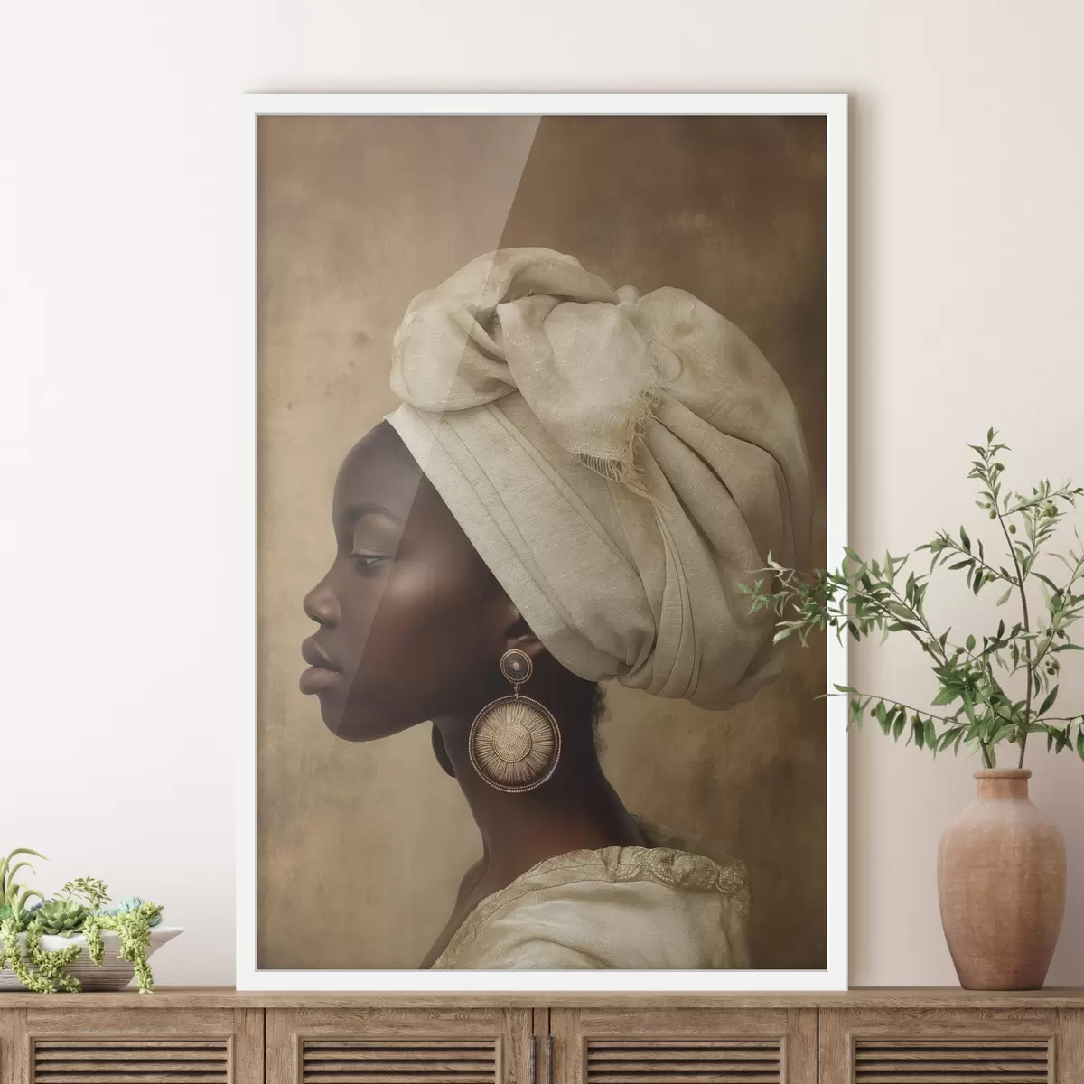 Poster ritratto beige di una donna in stile africano di profilo con grandi orecchini Nr f26120