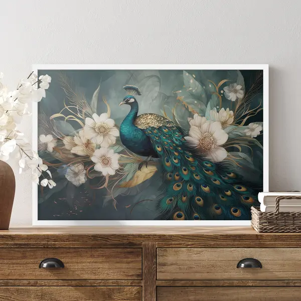 Poster Un vibrante pavone tra delicate fioriture Nr f34866