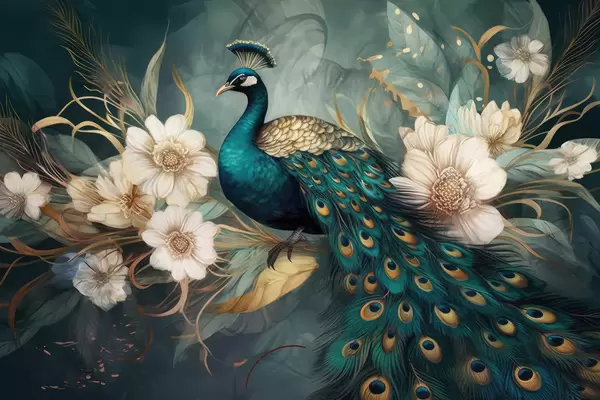 Poster Un vibrante pavone tra delicate fioriture Nr f34866