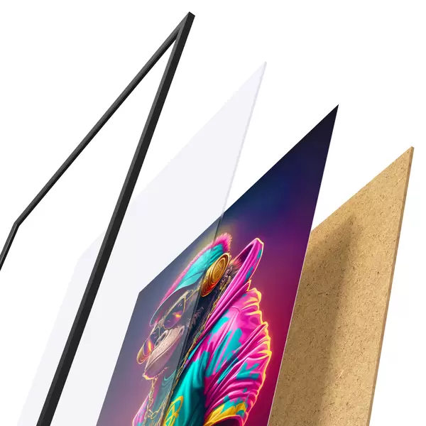 Il poster è composto da cornice, plexiglass, immagine stampata e supporto in truciolato. Il poster può essere immediatamente appeso alla parete grazie ai supporti sul retro.