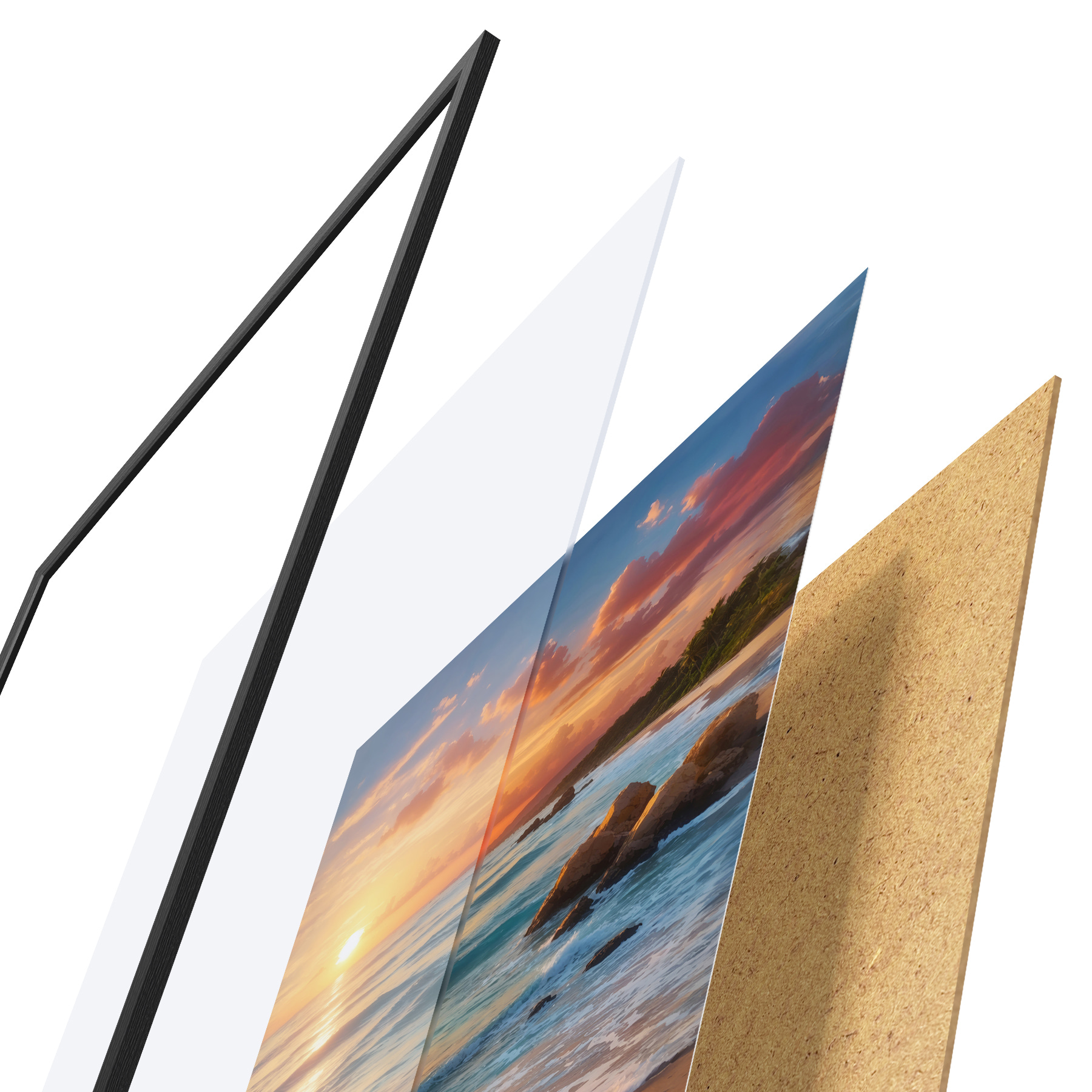 Il poster è composto da cornice, plexiglass, immagine stampata e supporto in truciolato. Il poster può essere immediatamente appeso alla parete grazie ai supporti sul retro.