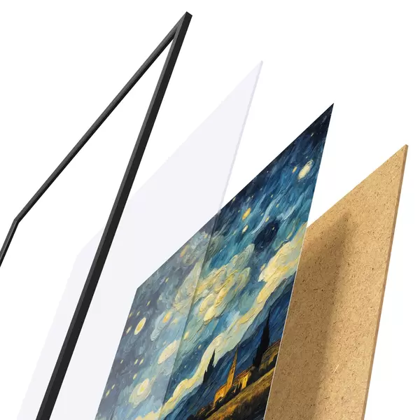 Il poster è composto da cornice, plexiglass, immagine stampata e supporto in truciolato. Il poster può essere immediatamente appeso alla parete grazie ai supporti sul retro.