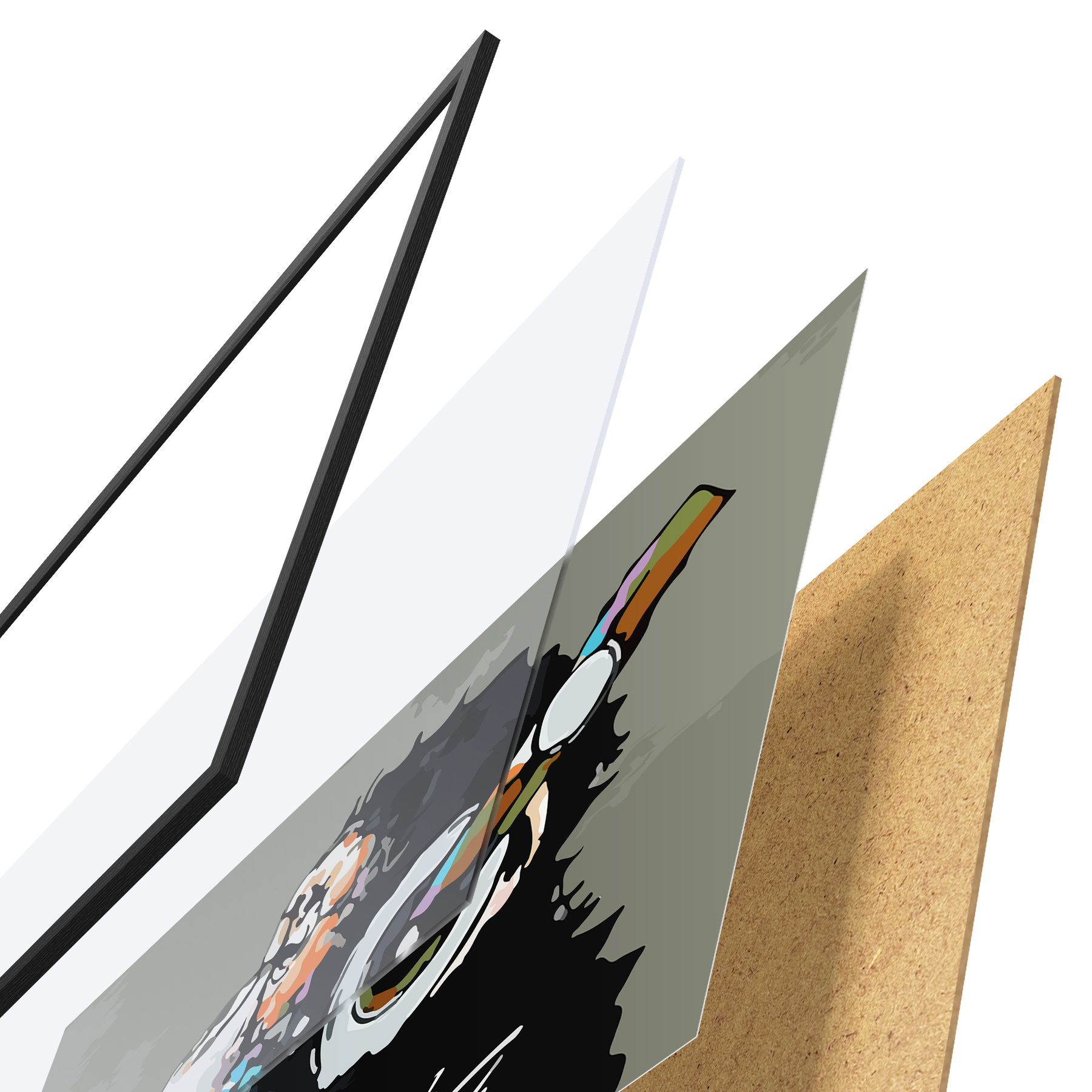 Il poster è composto da cornice, plexiglass, immagine stampata e supporto in truciolato. Il poster può essere immediatamente appeso alla parete grazie ai supporti sul retro.