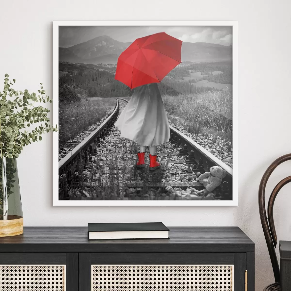 Poster Persona con ombrello rosso sui binari del treno f37301