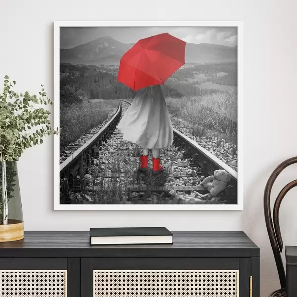 Poster Persona con ombrello rosso sui binari del treno Nr f37301
