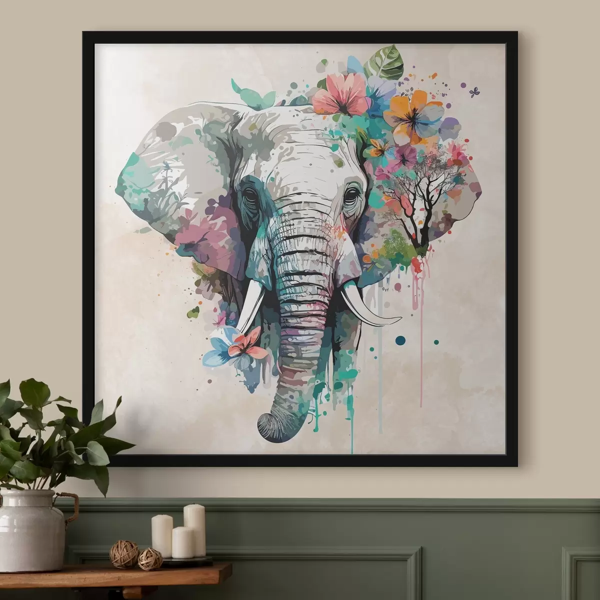 Poster elefante in fiori, macchie di vernice f38333