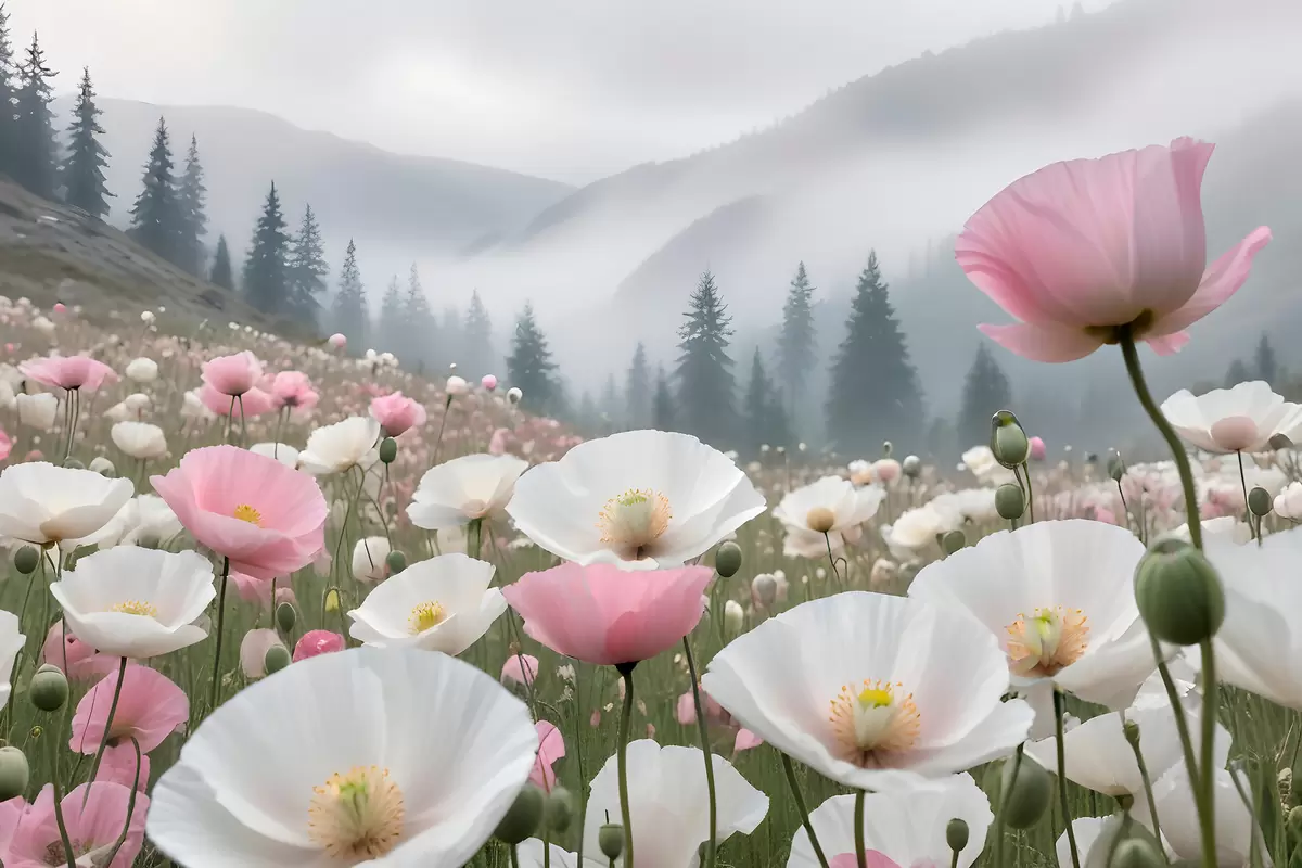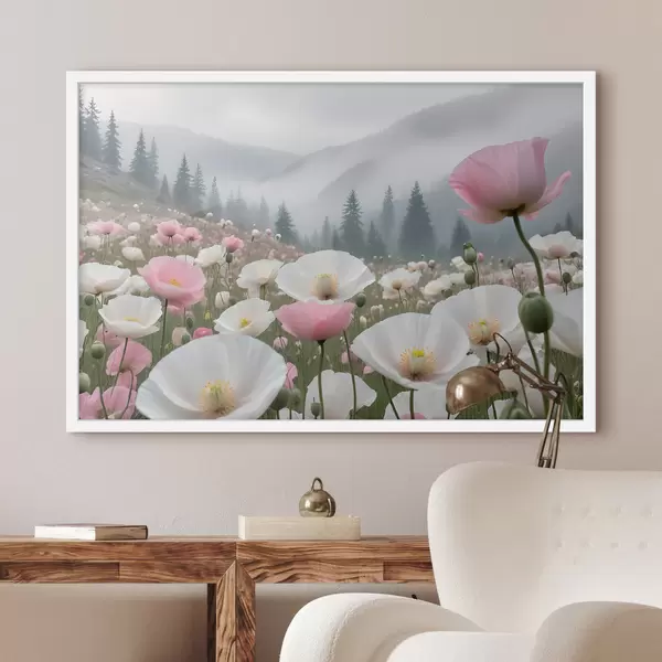 Poster Un campo di papaveri rosa e bianchi nel paesaggio montano sullo sfondo Nr f38369