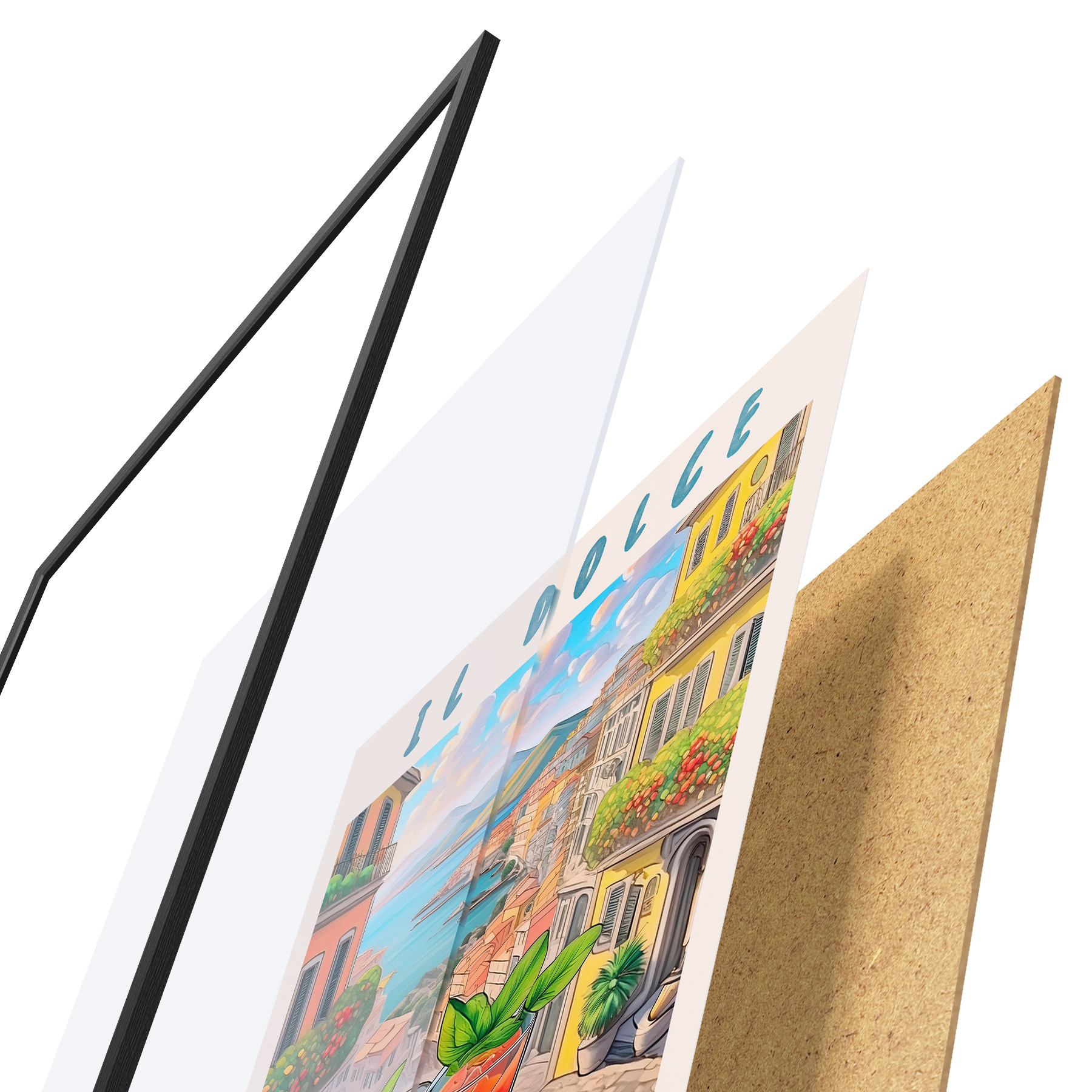 Il poster è composto da cornice, plexiglass, immagine stampata e supporto in truciolato. Il poster può essere immediatamente appeso alla parete grazie ai supporti sul retro.