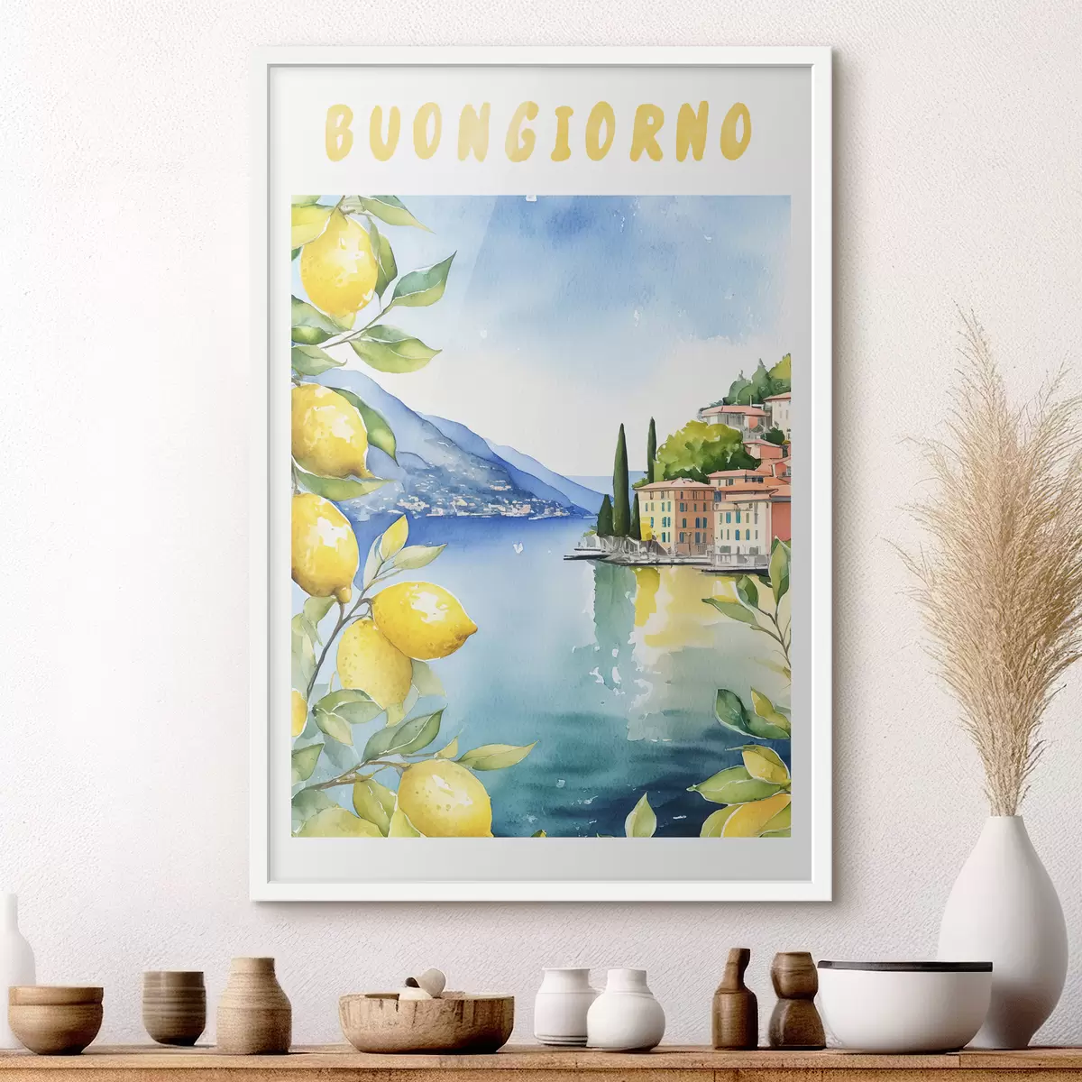 Poster Lago italiano, estate, acquerello, paesaggio naturale, limoni, architettura cittadina f38394