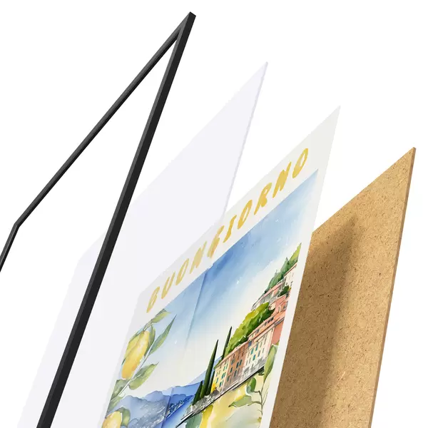 Il poster è composto da cornice, plexiglass, immagine stampata e supporto in truciolato. Il poster può essere immediatamente appeso alla parete grazie ai supporti sul retro.