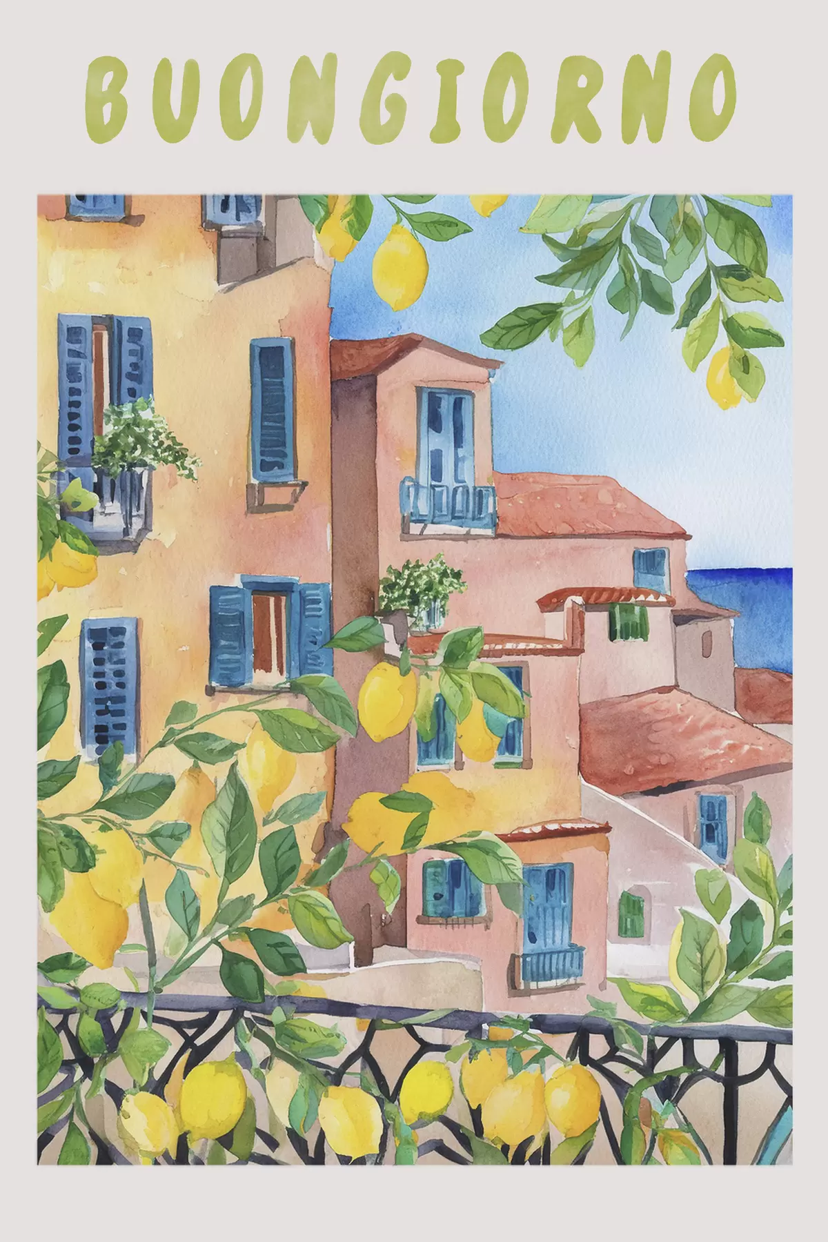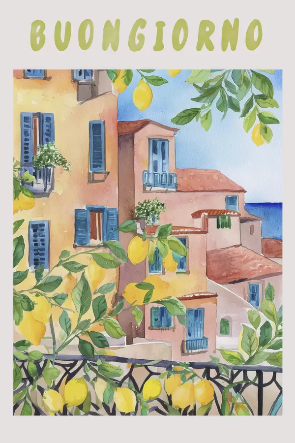 Poster Architettura della città italiana, costa del mare, estate, acquerello, albero di limone Nr f38395