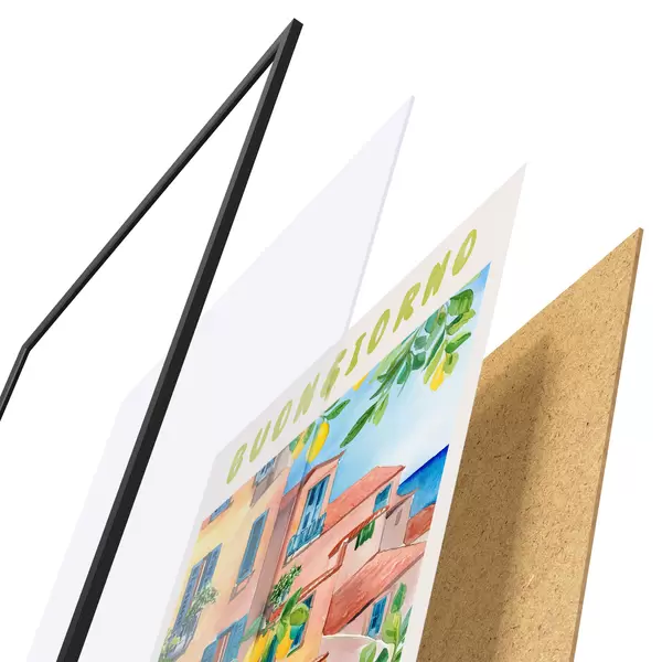Il poster è composto da cornice, plexiglass, immagine stampata e supporto in truciolato. Il poster può essere immediatamente appeso alla parete grazie ai supporti sul retro.