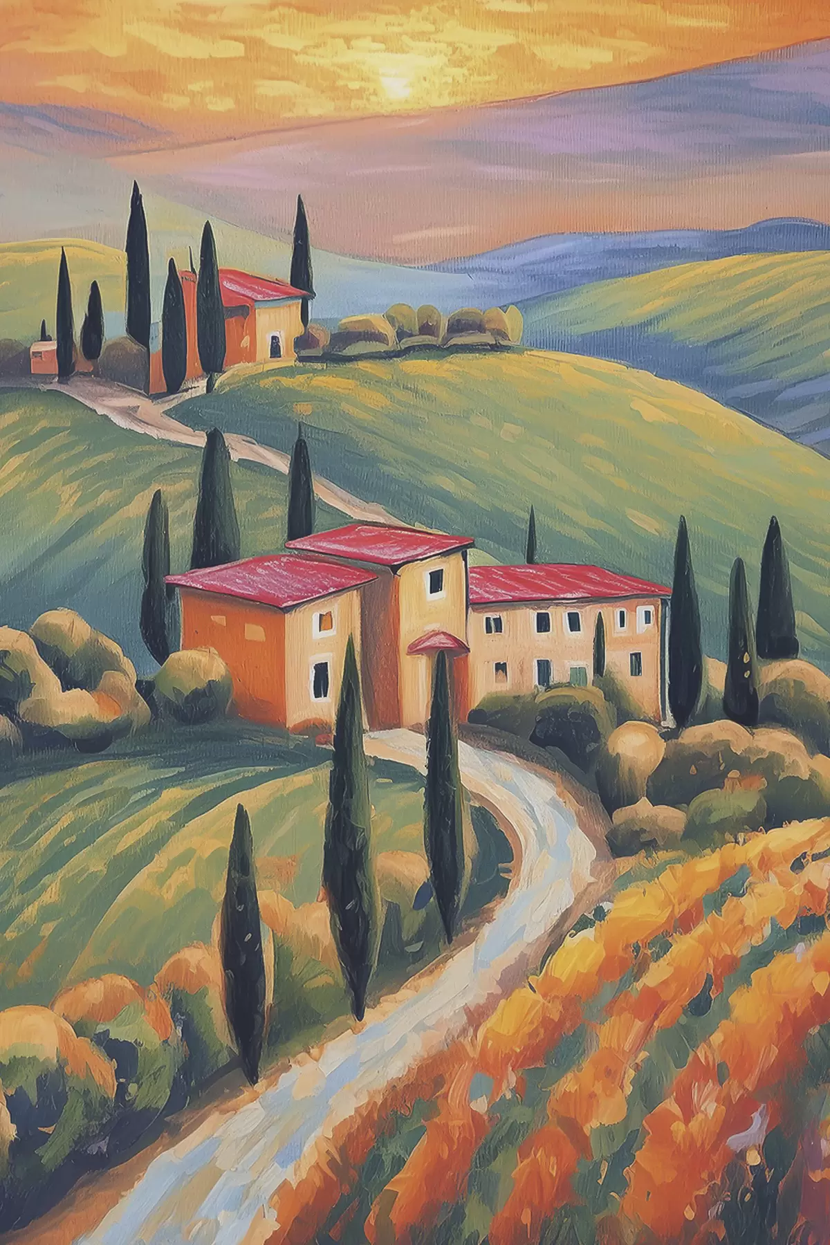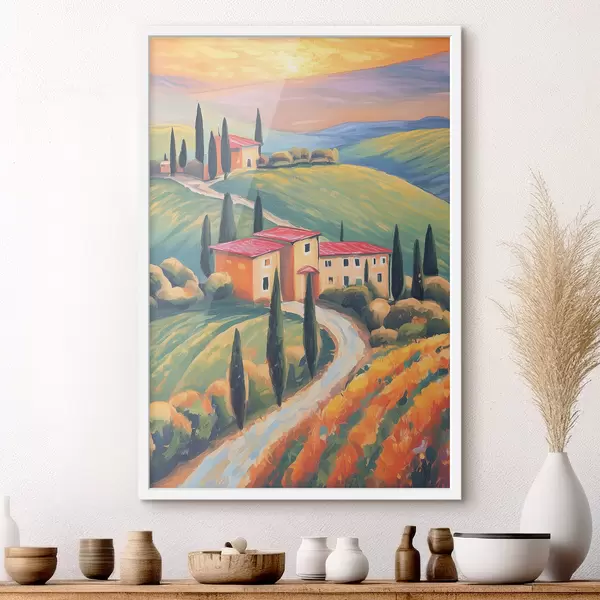 Poster Paesaggi toscani, Italia, pittura acrilica, vecchie case, campi, estate Nr f38488
